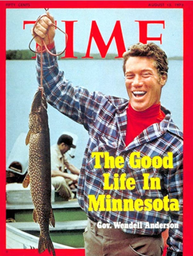 When I redesigned my home office to record my podcast, I wanted the decor to reflect my love of politics and my deep roots in the state of Minnesota. I knew exactly what I wanted on my wall: a pristine copy of TIME magazine from August 13, 1973. On the cover stands Governor Wendell Anderson, proudly holding a northern pike with the headline "The Good Life in Minnesota.”